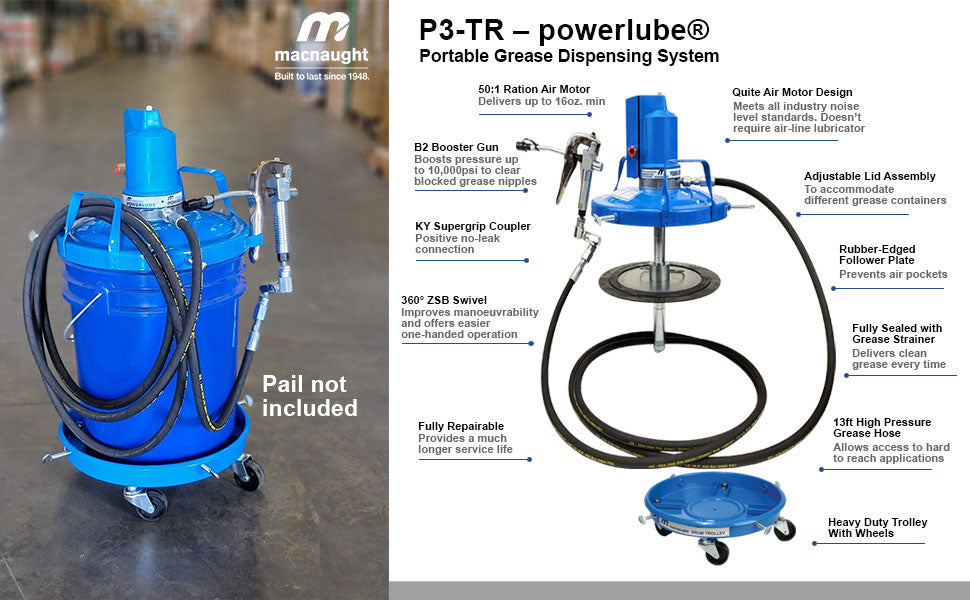 Macnaught’s 50:1 P3-TR air-operated grease pump system is engineered for 35 lb./5 Gal. containers. Our Pneumatic Grease pumps have low air consumption motor & don’t need to be lubricated due to the use of modern polymer materials. Quiet air motor design – Meets all industry noise level standards. Includes the B2 Booster Gun – Boosts greasing pressure up to 10,000 psi. 50:1 ratio air motor delivers up to 16 oz/min of fast, efficient grease output. Users will save on power and avoid the oily mist and mess typically associated with air-operated equipment.